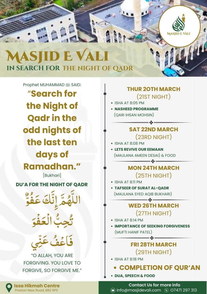 Join us at Masjid E Vali as we come together in worship, reflection, and remembrance during the blessed odd nights of Ramadhan.